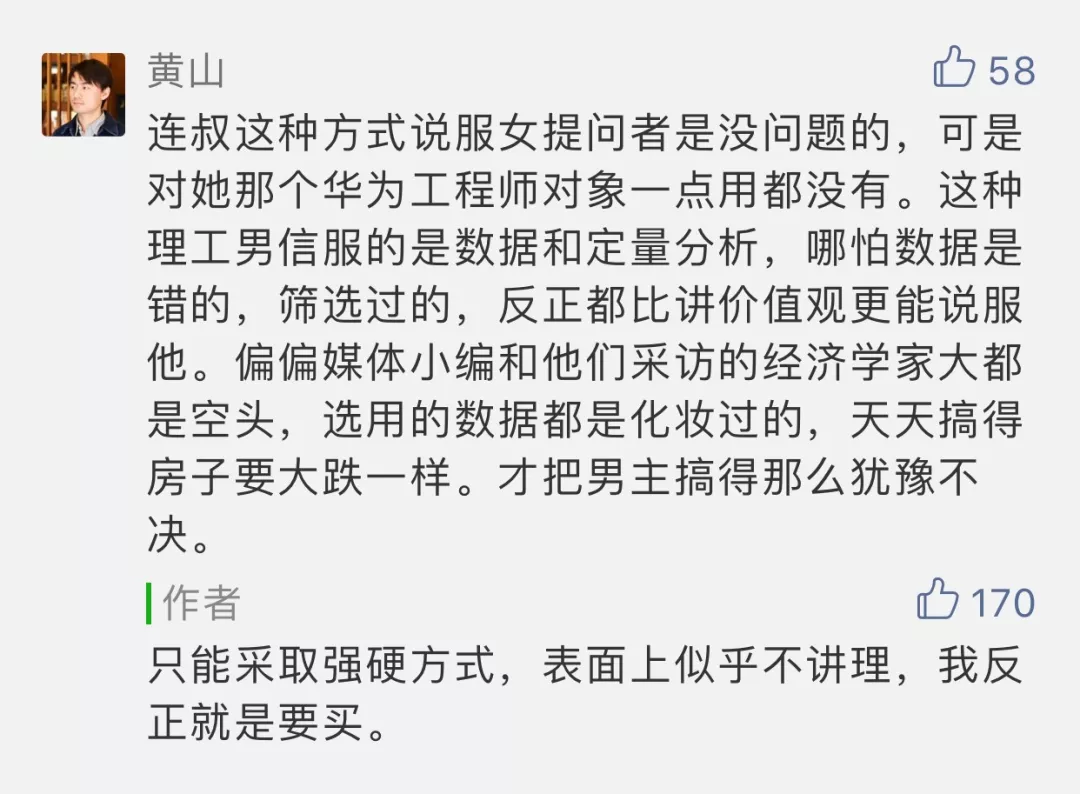 他不讲道理。你也只能用不讲道理的方式,直接下命令:我不辩论,也不想再听你扯淡,即使将来房价跌,我也需要房子,马上去看,两个月内就买,否则等着瞧。